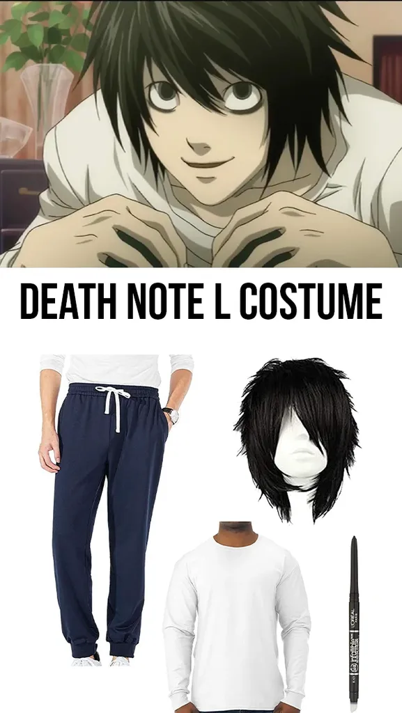 Ha lusta érzed ezt a Halloween -t, és egy egyszerű jelmezt akarsz, L a srácod! A titokzatos nyomozónak csak fehérre van szüksége hosszú ujjú ing egy pár sötét pulóveres nadrágok és a Rendetlen fekete paróka! Te használhatja a szemceruzát hogy tökéletesítse a sötét köröket.